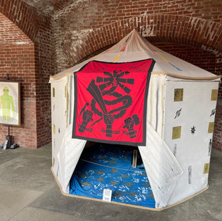 “By Land By Sea By Star” is the title of Umar Rashid’s tent installations. The tents explore the legacies of William Shorey, James Beckwourth, and unknown future explorers. These men navigated the complexities of race, power, and survival. Shorey was a revered Black whaling captain based in Oakland, CA. Beckwourth was born a slave and became one of California’s trailblazing frontiersmen. Each tent depicts the man’s life with the third one unknown for what or who will shape the future. The chain needs no explanation.