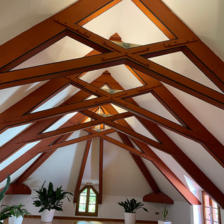 In the center of the house is a conservatory that brings in the sun, retains heat, and distributes it throughout the house. One can see the garden from almost every room and upstairs the vaulted room improved acoustics and windows fill every wall.