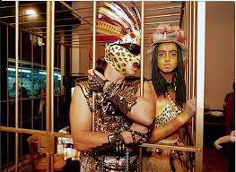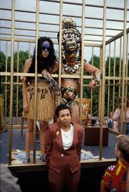 The “Couple in the Cage: Two Undiscovered Amerindians Visit the West” Fusco and another artist Nao Bustamante created fictional characters from a fictional island called Guatinau. They traveled throughout the US and to Australia where the public could view them living in a cage engaging in bizarre activities that many people who saw them believed were real. It confirmed the persistence of colonial fantasies in contemporary culture and even more so how people believed what they are told no matter how absurd.