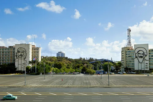 The empty plaza is Havana’s Plaza de la Revolucion. In the wake of the 2011 Arab Spring protest Fusco questions why this square is mostly empty? Many important events in Cuban history happened here and now it’s just a large hot empty space with tourists taking photographs. That’s her in the red dress walking back and forth and the images on the buildings are Che Guevara (on the left) and Karl Marx (on the right). The images are shown lit up at night in the video.